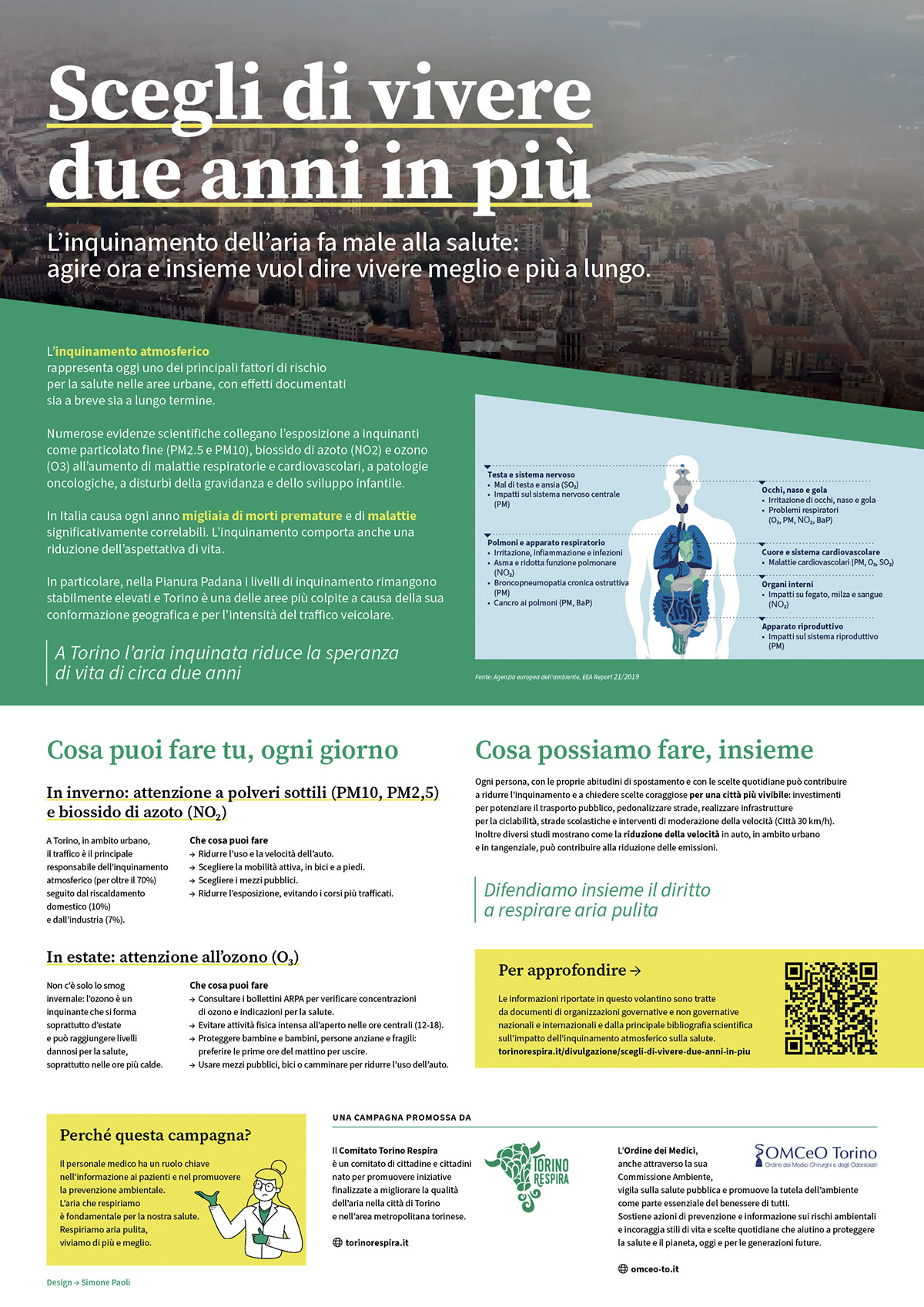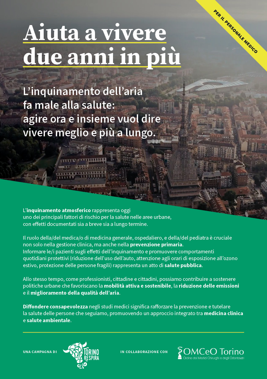 Scegli di vivere due anni in più è l’iniziativa nata dalla collaborazione tra il Comitato Torino Respira e l’Ordine dei Medici Chirurghi e degli Odontoiatri della Provincia di Torino (OMCeO Torino) e per la prima volta coinvolge gli studi medici di famiglia di Torino in una campagna informativa sull’inquinamento atmosferico e gli effetti sulla salute.