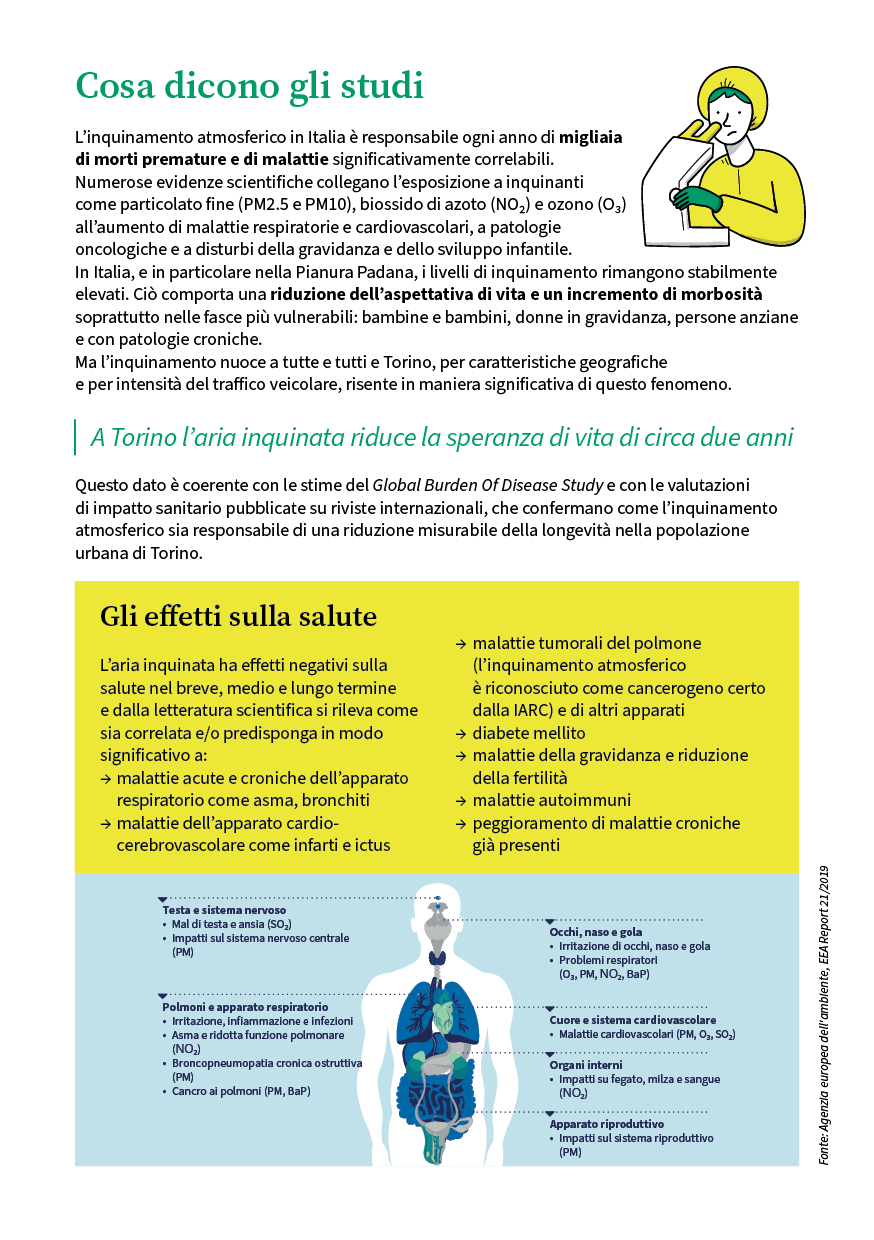 In particolare nella Pianura Padana, i livelli di inquinamento rimangono stabilmente elevati. Torino è una delle aree più colpite a causa della sua conformazione geografica e l’intensità del traffico veicolare. L’inquinamento comporta anche una riduzione dell’aspettativa di vita.